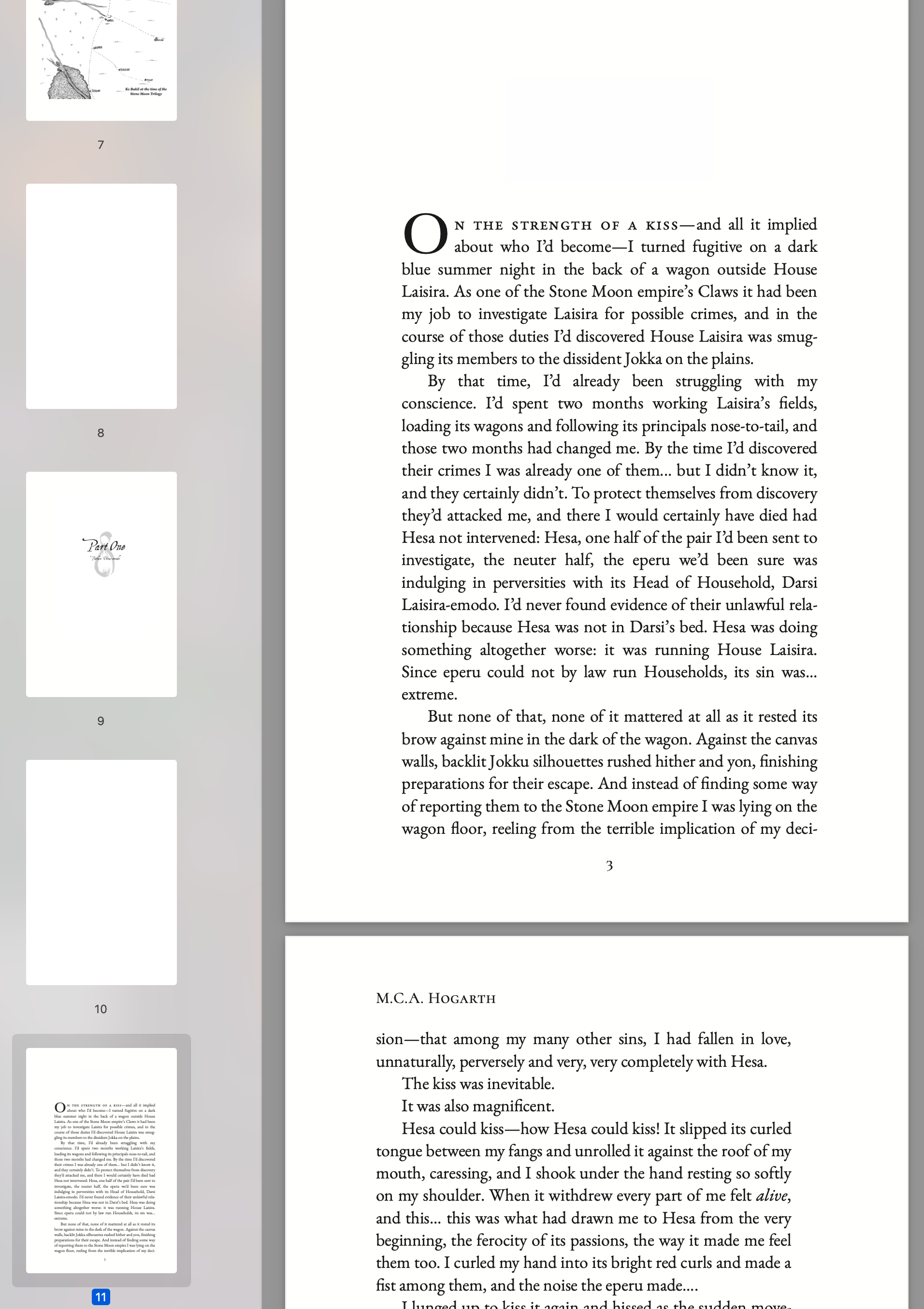 But none of that, none of it mattered at all as it rested its brow against mine in the dark of the wagon. Against the canvas walls, backlit Jokku silhouettes rushed hither and yon, finishing preparations for their escape. And instead of finding some way of reporting them to the Stone Moon empire I was lying on the wagon floor, reeling from the terrible implication of my decision—that among my many other sins, I had fallen in love, unnaturally, perversely and very, very completely with Hesa.