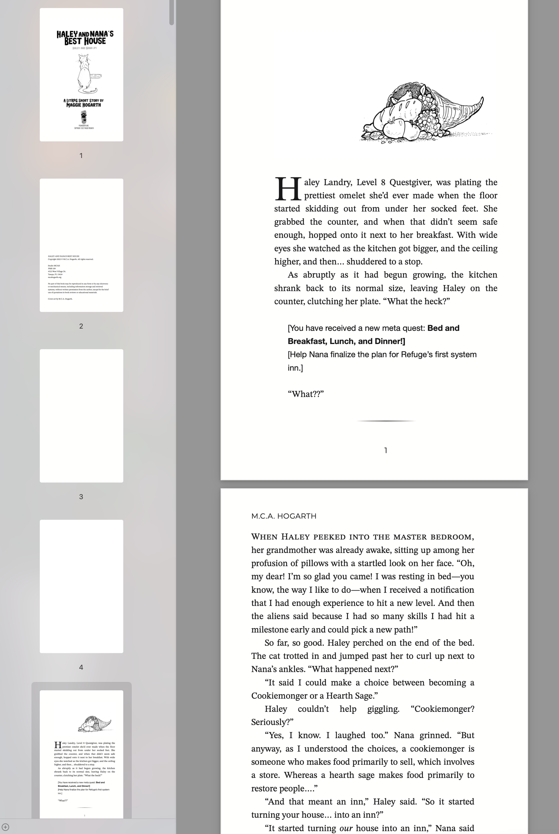 When Haley peeked into the master bedroom, her grandmother was already awake, sitting up among her profusion of pillows with a startled look on her face. “Oh, my dear! I’m so glad you came! I was resting in bed—you know, the way I like to do—when I received a notification that I had enough experience to hit a new level. And then the aliens said because I had so many skills I had hit a milestone early and could pick a new path!”