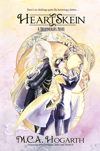 Heartskein is a cozy science fiction novel and returns to the dreamhealers in their new roles as powers in the new Eldritch Empire: Jahir is now a married man and a prince, and Vasiht'h an administrator, a lord, and a father! But no matter what changes, some things stay the same: like a bond of love stronger than wars and unconquered by time. Come unwind, and meet the babies!
