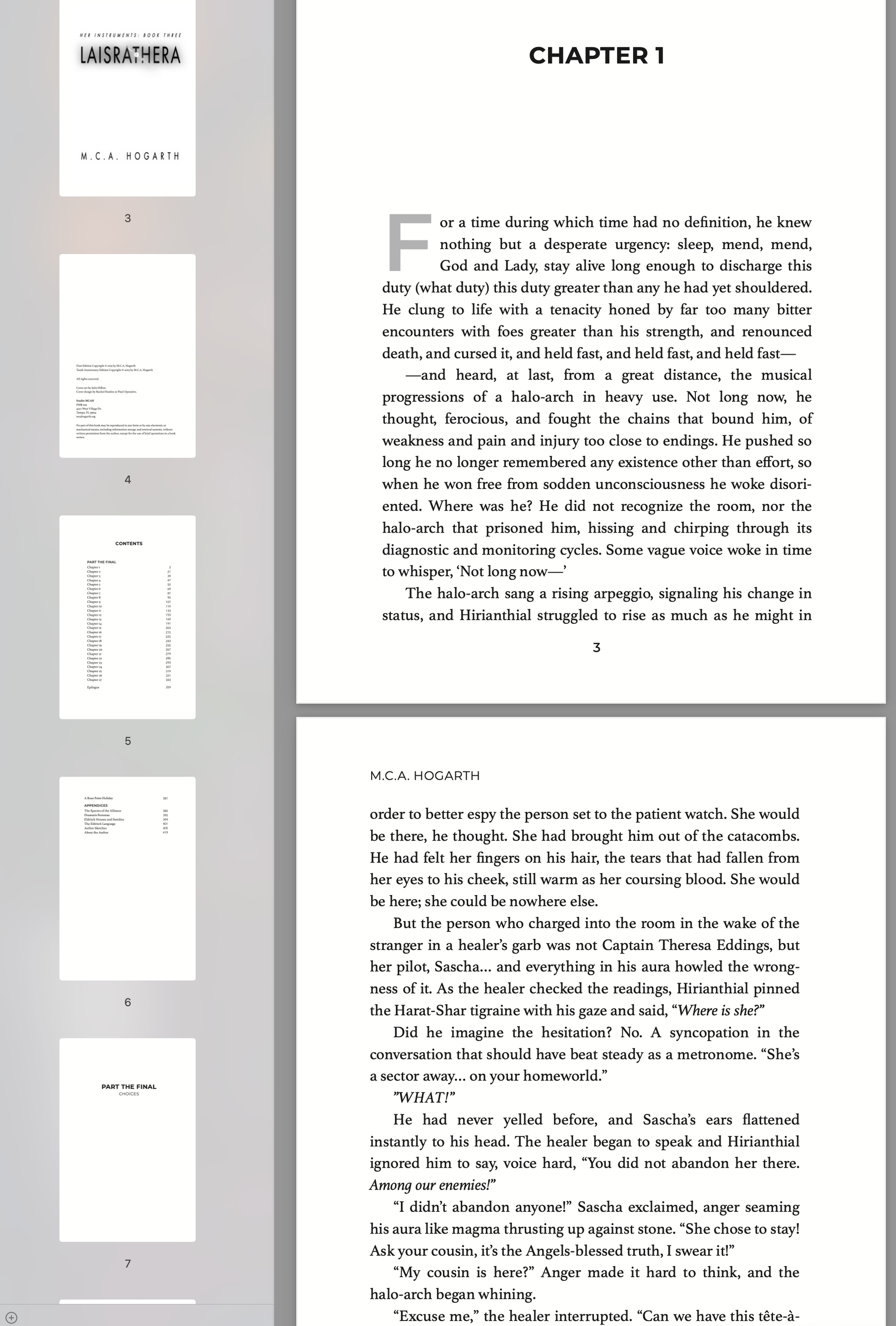 But the person who charged into the room in the wake of the stranger in a healer’s garb was not Captain Theresa Eddings, but her pilot, Sascha… and everything in his aura howled the wrongness of it. As the healer checked the readings, Hirianthial pinned the Harat-Shar tigraine with his gaze and said, “Where is she?”
