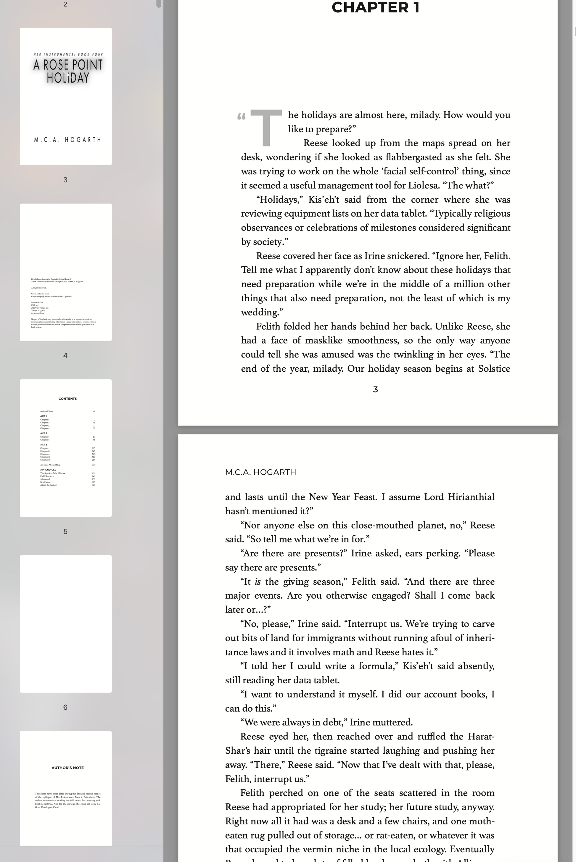 A Rose Point Holiday is a short, pastoral novel set during the last days before Reese becomes Theresa Laisrathera Eddings, lady of Rose Point Castle and the surrounding lands of Firilith. The Eldritch have never seen a holiday quite like this one!