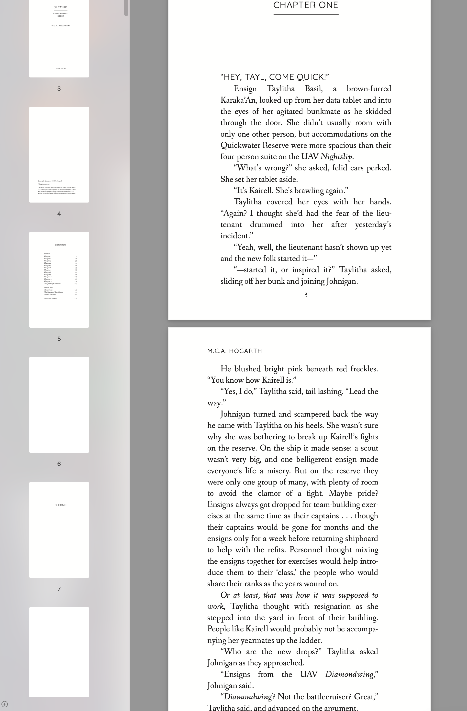 Ensign Taylitha Basil, a brown-furred Karaka’An, looked up from her data tablet and into the eyes of her agitated bunkmate as he skidded through the door. She didn’t usually room with only one other person, but accommodations on the Quickwater Reserve were more spacious than their four-person suite on the UAV Nightslip.