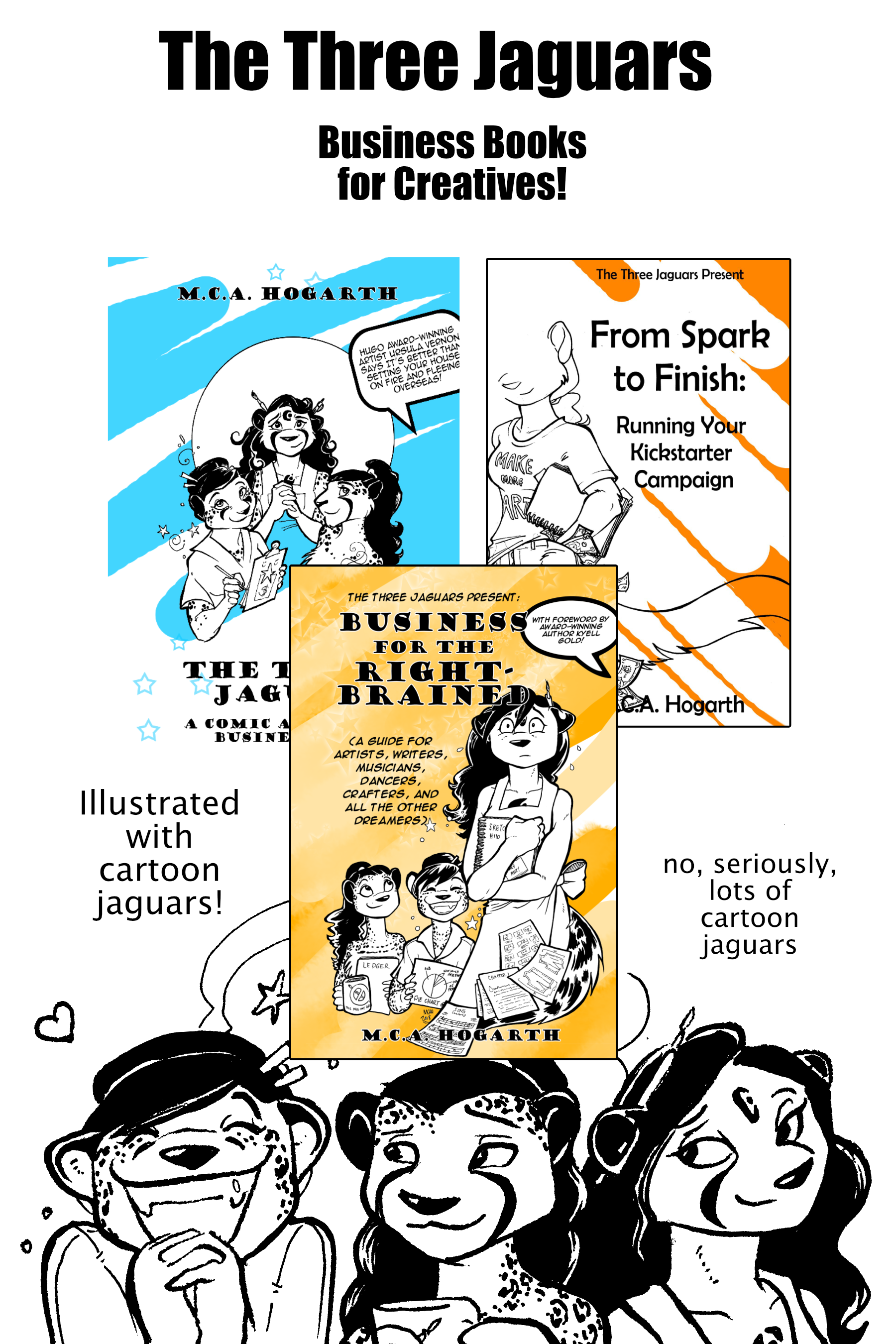 These books are not only very approachable, thanks to a profusion of cartoon jaguars, but also insightful, written from the point of view of someone who Gets It as an Artist. You won't find many hard numbers here-- but plenty of methodology, thoughts into why something might or might not work for you as an artist, and clarity into how to develop and shape a business from the ground up. If you've been thinking about dipping your toes into commissions, convention or mail sales, running a Kickstarter, this is a great investment.